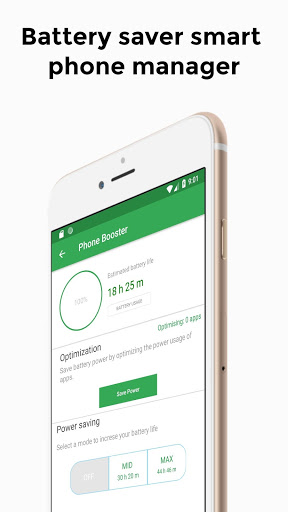 Phone Booster - Smart Manager app saves battery very smartly. It works as battery saver by providing options of medium battery usage and gives 30 hours timings and Maximum battery saving which gives timings of battery to 40 hours.
