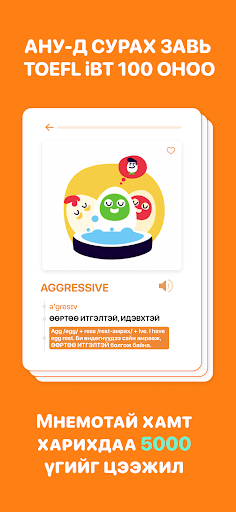 Мөн TOEFL iBT 100 оноо авахад хангалттай 5000 гаруй үгийн сантай бөгөөд үгийг цээжлэх Мнемоникс арга дээр суурилсан. Тус арга нь хүний өмнөх мэдлэг болон орон зайн санах ойтой холбож цээжлэх арга юм.
