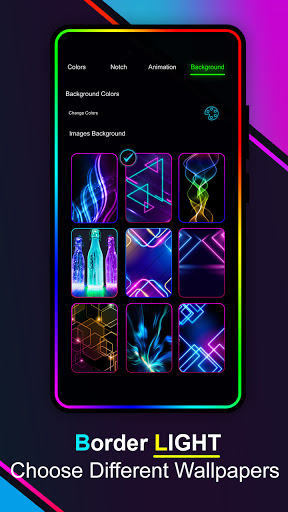 Edge lighting - Neon LED Border Light Wallpaper show multi-color light gradients movement across the border around the edge of your whole mobile device screen. It will adjust to your 📱mobile border frame with live edge border light color wallpaper. In this multi-color border light application, you can select different types of edges or borders.
