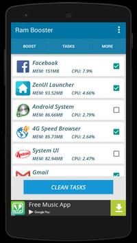 on first screen of the application by just clicking once your android phone will speed up. If you want to clean a background tasks then access second tab of the application. For information of your RAM access third tab on application.