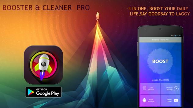 Booster & Cleaner Pro is a powerful Android Optimizer, Speed Booster, Junk Cleaner, App Manager & Battery Saver, it helps accelerate and clean up Android phones, you can boost your phone with one single click.