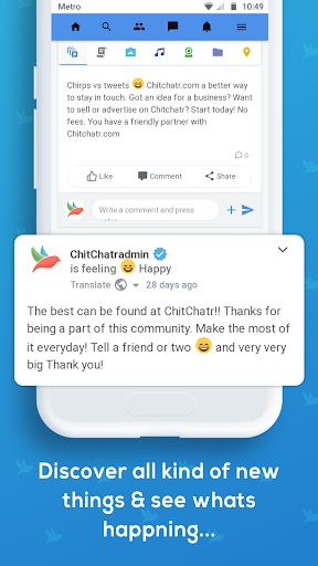 Our app wants to know "what's going on with you?" so you can share your thoughts and connect with others. See a post you like? send them a like, chirp back and leave a comment. There are many ways to connect on chitchatr