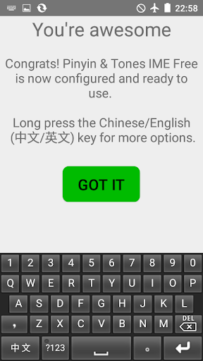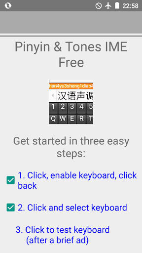 **Pinyin & Tones IME Chinese evaluation version requires "internet" and "access network state" permissions to serve Google advertisements. These permissions are not used for any other purpose. If you wish to use an offline version, please upgrade to the Plus version.**