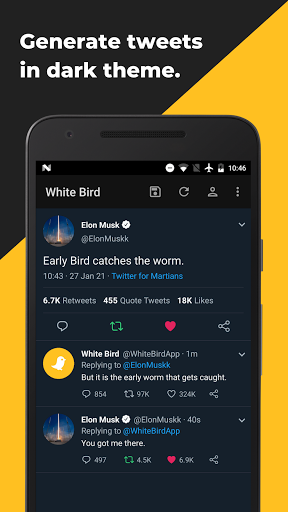 DISCLAIMER: White Bird is a free app whose sole purpose is to let users create custom tweets for entertainment purpose. TMM Lab, developer of White Bird shall not be liable for any misuse of the app by users. White Bird is not associated with Twitter.