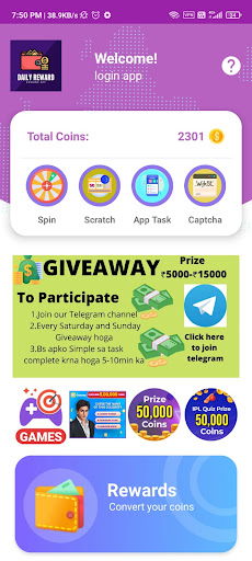 Daily Rewards Earning App is the best money earning app in 2022. Earn unlimited FREE Cash with Earning App by Spin To Win, Scratch to Win, Captcha to Win, Play quiz and earn money, Play games and earn money and also watch videos to earn money . You will get 50 Spin Wheel, 50 Scratch Card, 50 Captcha, 50 Quizzes, and 50 Games per day for earn real cash without investing your money.You will get up to ₹50 rupees when your friends register using your refer code and You will get 500 coins for free the first time after you Sign up the Daily Rewards earning app.