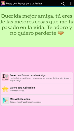 Desde ya te agradecemos por descargar nuestra Aplicación de Fotos y Imágenes con Frases para tu Mejor Amiga para que las puedas compartir con tus amigas que más quieras. Si te gusto nuestra aplicación Fotos y Imágenes con Frases para tu Mejor Amiga te agradeceríamos que le des cinco estrellas para que nos motives a hacer muchas más aplicaciones. Disfruta de nuestra App.