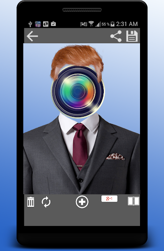 Easy hit the centered button to add Trump Hair to your picture. Place it on the right position and save with the top right savebutton. Share with your friends and family showing how the next president will look like.