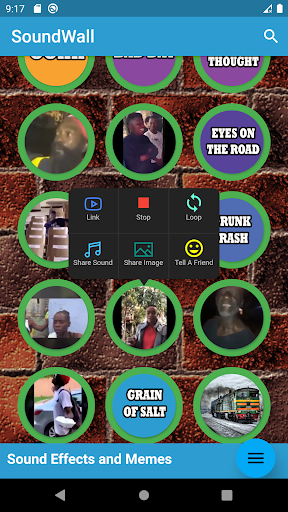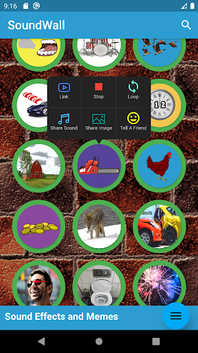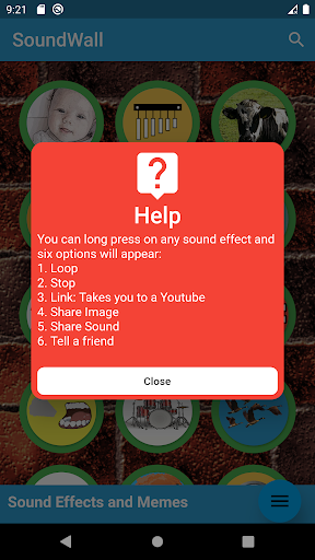 This app allows users to play sound effects and meme sounds. In order to see the options menu you simply long press on any sound effect. Clicking on the menu button in the bottom right corner will allow you to reverse the order of sound effects, display only memes, view the help page, leave a review and view the info page.