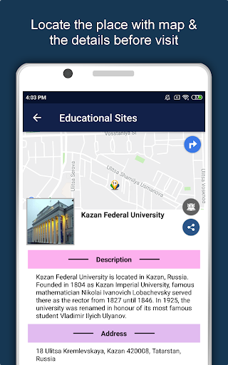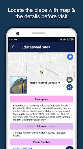 Apart from this, Kazan Travel & Explore guides you Why, When and How to visit various places in Kazan with precise location on the detailed Map. There are two ways to explore this app - Category view and EduBank favorite places view. Pin your destinations and get the routes on the Map. Not only this, you can see exactly how the places look like with Street View integrated in this app. The app also has a feature to Rate and write Review/Experience regarding entity(s) through Login. Your Travel experience and rating will help the user community.