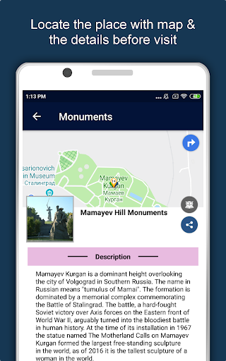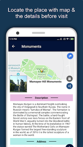 Apart from this, Volgograd Travel & Explore guides you Why, When and How to visit various places in Volgograd with precise location on the detailed Map. There are two ways to explore this app - Category view and EduBank favorite places view. Pin your destinations and get the routes on the Map. Not only this, you can see exactly how the places look like with Street View integrated in this app. The app also has a feature to Rate and write Review/Experience regarding entity(s) through Login. Your Travel experience and rating will help the user community.