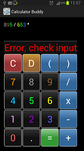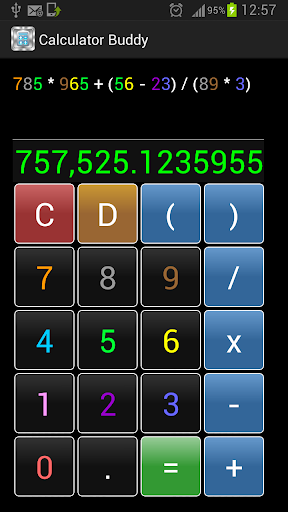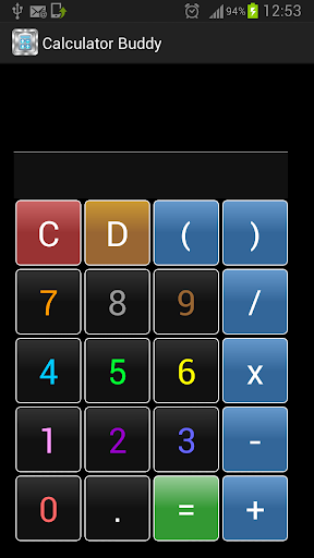A colourful calculator App with sounds. Each number has its own corresponding colour. Calculations can be input up to three lines ( approximately 70 numbers/symbols ). Delete button lets you delete the last inputted numbers/symbols one by one. Also contains a clear button which clears the screen of any calculations.