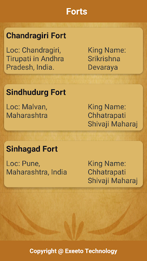 In kings section You will find detail of kings and in forts section there is information about the fort. Speciality of the forts is also given in the forts section.