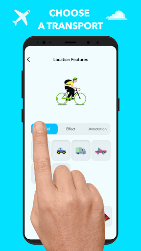 Too easy. Choose your means of transport, enter your route, press the START button and enjoy the fun animation of your trip. Share your trips with friends in the language of video cards.