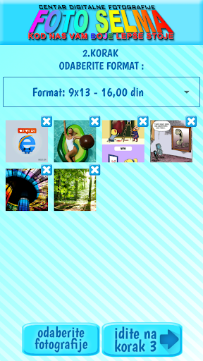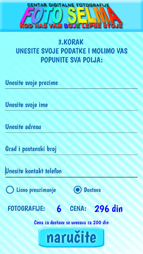 Na prvom koraku ćete odabrati fotografije iz Vaše gallerije, zatim ćete odabrati format u kom želite da izradim Vaše fotografije. I na kraju popunjavanjem svojih podataka sačekajte par minuta (u zavisnosti od broja slika koje nam šaljete). Nakon toga ćemo Vas kontaktirati radi potvrde porudžbine i dogovora oko dostave ,odnosno ličnog preuzimanja.