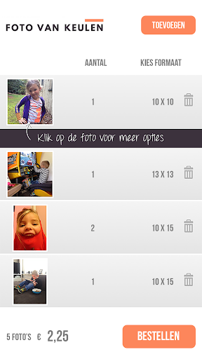 Je smartphone zit waarschijnlijk vol met foto’s. Logisch, want je gebruikt hem steeds vaker als fotocamera. Met deze foto’s kan je van alles doen. Je kan ze toevoegen aan een bericht op Facebook, versturen in een chatbericht via WhatsApp of … laten printen op de allerhoogste kwaliteit via deze app! Installeer nu de app en ervaar hoe eenvoudig het is om foto’s te bestellen direct vanaf je smartphone of tablet. Naast foto’s kunt je ook canvas en fotogeschenken bestellen via deze app.