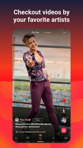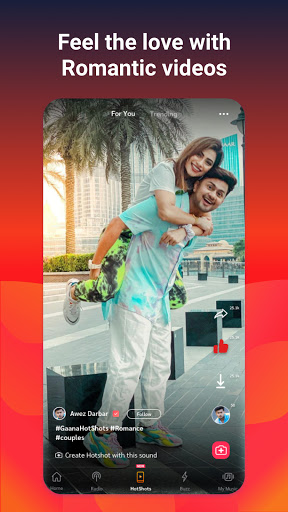 Checkout and create videos according to your interest across different categories like funny comedy, pranks, dance, fitness, romance, fashion, food, filmy, music, dubbing, lip sync. Earn Gems for creating each HotShots videos and redeem for cash. Gaana HotShots short video app gives you a stage to show your talent and become famous by showing videos to the large base of more than 185million users on Gaana. Download and share videos on whatsapp and social media with family and friends; increase your followers in just a single tap.