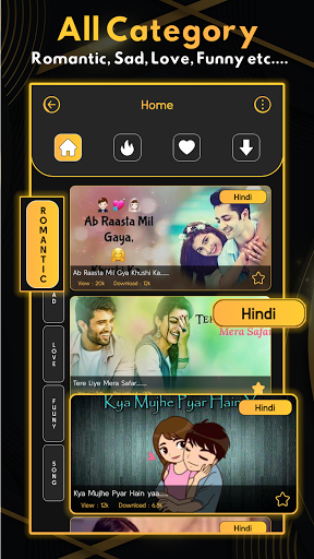 Love Video Status, Sad Video Status, Romantic Video Status, TikTok Video Status, Cute Video Status, Friendship Video Status, Attitude Video Status, Proposal Video Status, Cool Video Status, Funny Video Status, Festival, Fathers Day Video Status, Friendship Day Video Status, Navaratri Video Status, Independence Day Video Status, Diwali Video Status