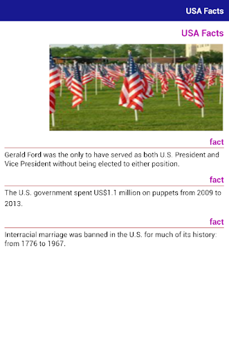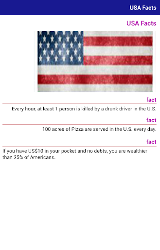 With USA Facts, finding a fact is made easier and sharing this fact on social network is made fun. Choose your favorite daily USA Facts and share it with friends and family!