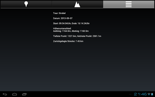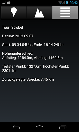 - Zusammenfassung der Tour mit Daten wie zurückgelegte Entfernung und auf-/abgestiegene Höhenmeter, Höhenunterschied und Dauer.