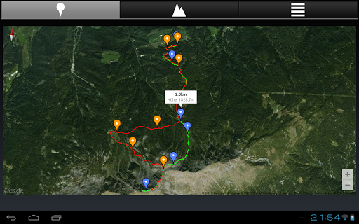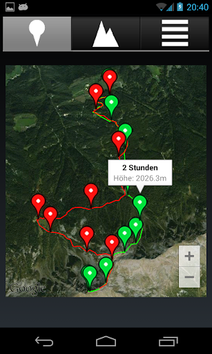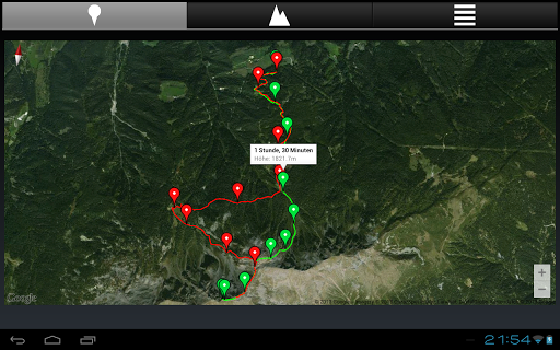 - Darstellung der zurückgelegten Strecke auf einem Satellitenbild, aufgeteilt nach Hin- und Rückweg