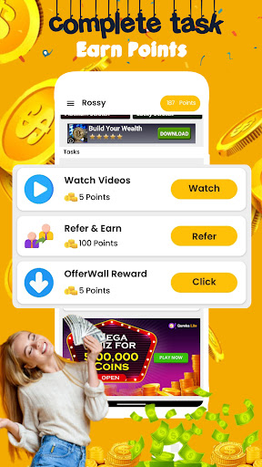 Rossy Earning App is the best money earning app in 2022. Earn unlimited FREE Cash with Earning App by Spin To Win, Scratch to Win, Captcha to Win, Play quiz and earn money, Play games and earn money and also watch videos to earn money. You will get 5 Spin Wheel, 5 Scratch Card, 5 Captcha, 5 Quizzes, and 5 Games per day for earn real cash without investing your money.You will get up to ₹50 rupees when your friends register using your refer code and You will get 500 points for free the first time after you Sign up the Rossy Daily Reward Earning App.Earn money and get paytm cash/Bank transfer/UPI in just 5 min.