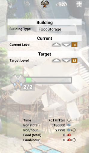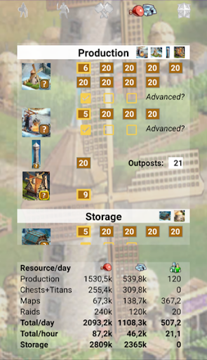 - Resource production and storage capacitiy calculation (food, iron, recruits)