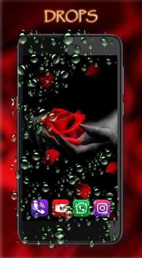 The application Roses Gothic Live Wallpaper realizes the realistic effect of water droplets on the glass. Drops of water on the phone's glass are scattered in a random order. At the touch of a drop, the dew changes the trajectory of motion.