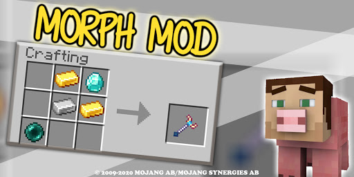 To turn into pixel craft mobs you have to craft a new item called Identity Absorber. After you have to right click the mob you want to morph into with Identity Absorber equipped in main hand. If you want to return normal you have to do the same with