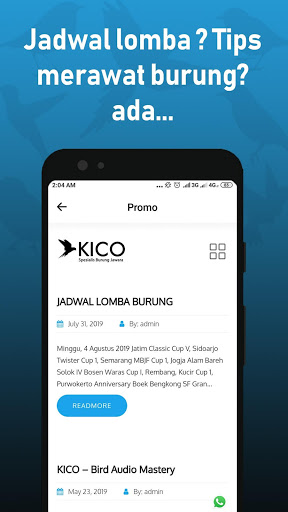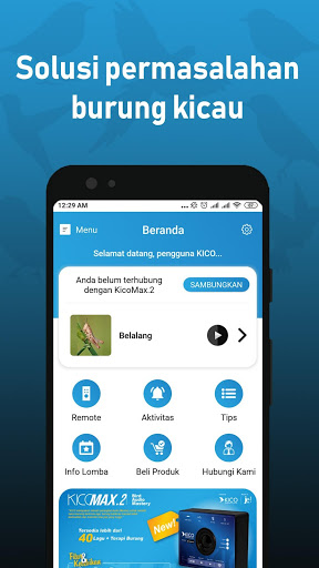KICO merupakan sebuah Aplikasi khusus untuk perangkat Bird Audio Mastery KICO MAX 2, serta di aplikasi ini kamu bisa mengakses ratusan tips merawat burung dan info lomba dari berbagai daerah di Indonesia.