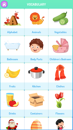 This game has 27 topics which are around kids real life: English alphabet, animals, fruits, color, careers, transports, home, food and number, fairy tales