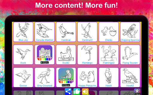 * Various difficulty levels, from the very simple birds images to quite detailed birds coloring pages.
