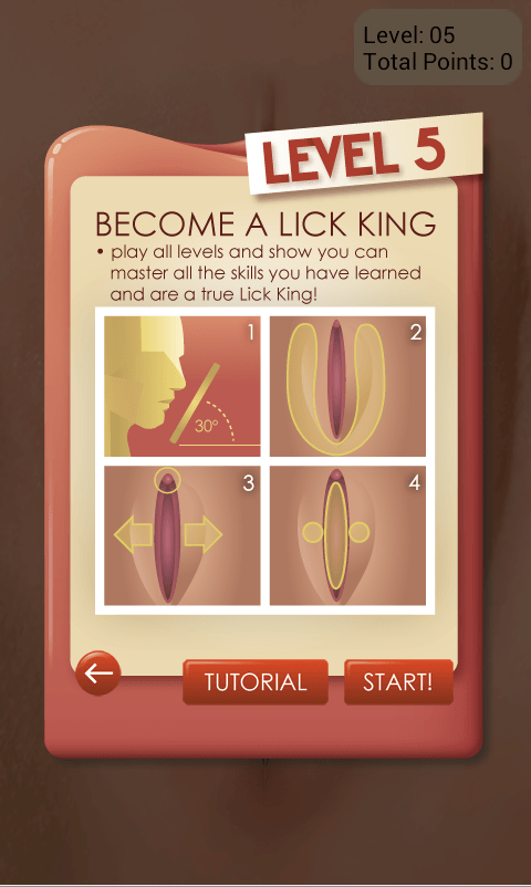 Challenge yourself and your skills to win different badges! Lick King App is a fun and educational game that will help you become an oral stimulation specialist, so you can redeem yourself in the eyes of any woman. You can also challenge your male or female competitors. In order to become a true Lick King you have to train your knowledge and skills and put them on the field. The game has five different levels, where you can first practice all the (four) skills you need separated from each other. Finally, level five will challenge you to use all necessary skills in the right order, in one constant flow. Try it! Have fun and good luck!