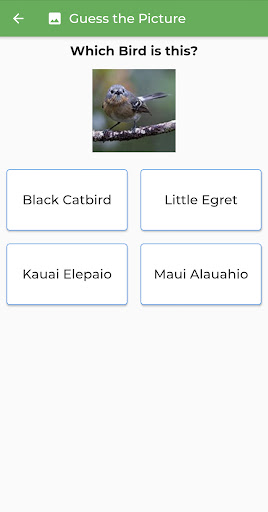Mini games are also included helping you to learn the different birds found in this app: Guess the Picture, Guess the Sound and Guess the Name.