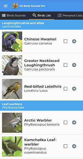 Birds can be grouped by family or alphabetical order, with and without headings, using the Birds Sounds settings.