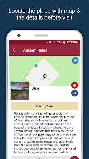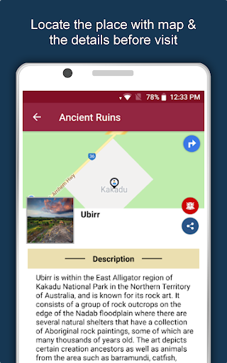 Apart from this, Australia Travel & Explore guides you Why, When and How to visit various places in Australia with precise location on the detailed Map. There are three ways to explore this app - Category view, City view and EduBank favorite places view. Pin your destinations and get the routes on the Map. Not only this, you can see exactly how the places look like with Street View integrated in this app. The app also has a feature to Rate and write Review/Experience regarding entity(s) through Facebook Login. Your Travel experience and rating will help the user community.