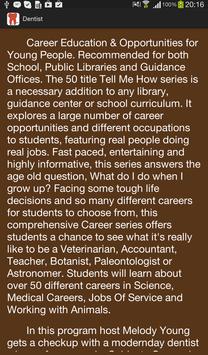 In this app host Melody Young gets a check-up with a modern-day dentist who performs magic. Subjects Covered Include: How long do you have to go to school to be a dentist? What makes a good dentist? What does a dental hygienist do? Is a dentist a doctor? What is a cavity? What is a filling? How are cavities formed? Do dentists make false teeth? What courses in school will prepare you for becoming a dentist? What other careers are related to dentistry? Can girls become dentists?