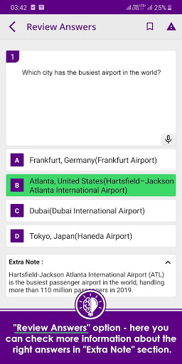 - "Review Answers" option - here you can check more information about the right answers in "Extra Note" section.