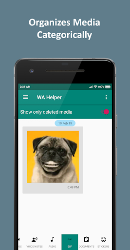 Whenever someone sends you a message and it appears in the notification panel, WA Helper will try to make a backup of it on your device and whenever the sender deletes it WA Helper will notify you immediately. In addition to this WA Helper will also check your storage to see whether any file was deleted, if so WA Helper will notify you immediately.