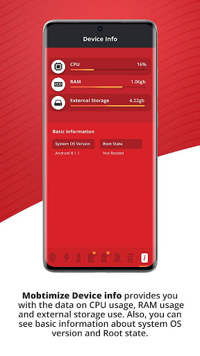 Stay in touch with important metrics such as CPU & RAM Usage, External Storage as well as basic information about your device like OS Version and Root State.
