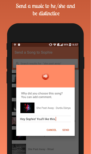 •Choose a song you want, add your comments to it and send him/her to break the ice.