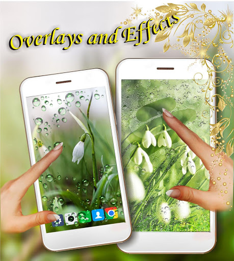 The application Snowdrops Spring live wallpapar has the ability to connect - disable the interactive effect of water droplets on the glass. Realistic drops of dew on the screen are scattered over the surface of the glass. Interactive finger tap causes a change in direction.