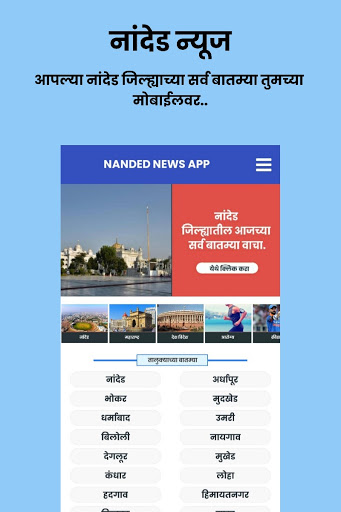Nanded news app (नांदेड न्यूज) is local news app for Nanded city and district. Nanded is a city in Maharashtra state, India. It is the eighth largest urban agglomeration of the state and the seventy-ninth most populous city in India. It is the second largest city in Marathwada subdivision. Nanded is the centre of governance of Nanded district.  This local news app coverage and updates on Local news, Politics, Entertainment news, Sports, Health, Jobs alert and much more.