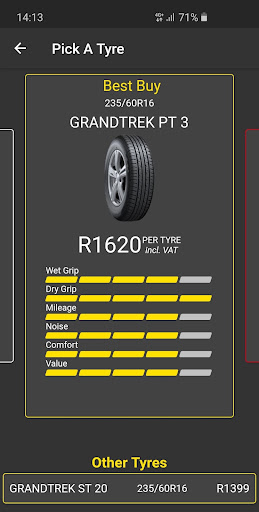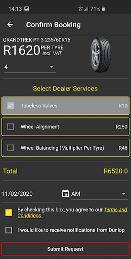 Dunlop's My Tyres app is the ideal place for you to manage your vehicles and tyres! Capture your vehicle’s details with our nifty Licence Disc Scanner, and when your car licence is up for renewal you can quickly and easily get your renewal quote and pay in the app - no more long queues! You can also find your nearest dealer and get instant pricing on the right tyres for your vehicle.