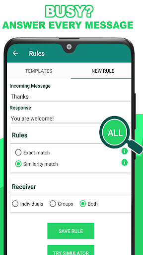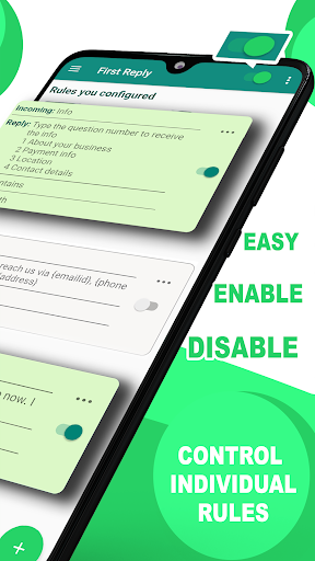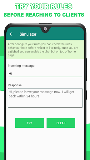 Auto responder or Chatbot that respond to a custom received Whatsapp or/and Whatsapp Business messages with this application. You have a unlimited number of settings to customize each auto reply for your needs. Download now for free and amaze your friends or clients with your own bot!