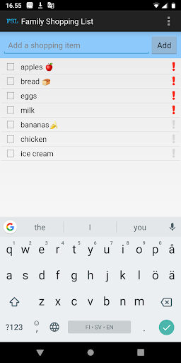 - Now you can put exlamation mark (!) in the end of the text and it makes the shopping item automatically a high priority item