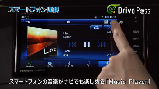 「Music Player for Drive P@ss」をインストールしたAndroidスマートフォンと「Drive P@ss」対応のカーナビを接続することで、車のスピーカを通して、良い音でいつもの音楽を楽しむことができます。