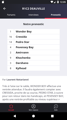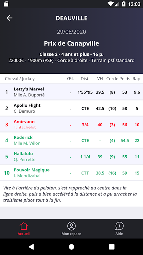 Ayrıntılı performansı sayesinde bir kalkış şeklini ve değerini değerlendirin.At, bugün karşılaştığı rakipler (hatlar) ve yarışın ilk beşi ayrıntılı.Sınıflandırma, atların adı, jokeylerin veya sürücülerin adı, körleştirmeler, salıncak, cinsiyet, yaş, sayılar, varıştaki mesafeler, kazanan zamanları, kilometrik indirimler, handikap değerleri, halat ve son boyutlar ayrıntılı performans oluşturur.Gazeteciler Paris-Turf tarafından yazılan yarış sırasında atın davranışıyla ilgili yorumunuzu tamamlayın.Yarıştan sonra, her bir bahsi raporlarına danışın (basit kazanan, basit yerleştirilmiş, birleştirilmiş kazanan, üçlü, süper 4, multi, üçüncü, dörtlü, quinté, pick5). Paris-Turf'tan uzmanların yorumlanan prognozu ile rehberlik ediyorsunuz.