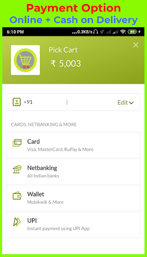 COD, credit & debit cards, net banking, wallet (Paytm, MobiKwik, etc)