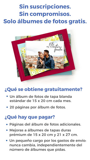 Solo pagas unos pequeños gastos de envío. Sin suscripciones. Sin compromisos™. Solo álbumes de fotos gratis.