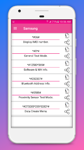 Check all android secret codes include Network, WLAN test, Firmware version information, factory tests,